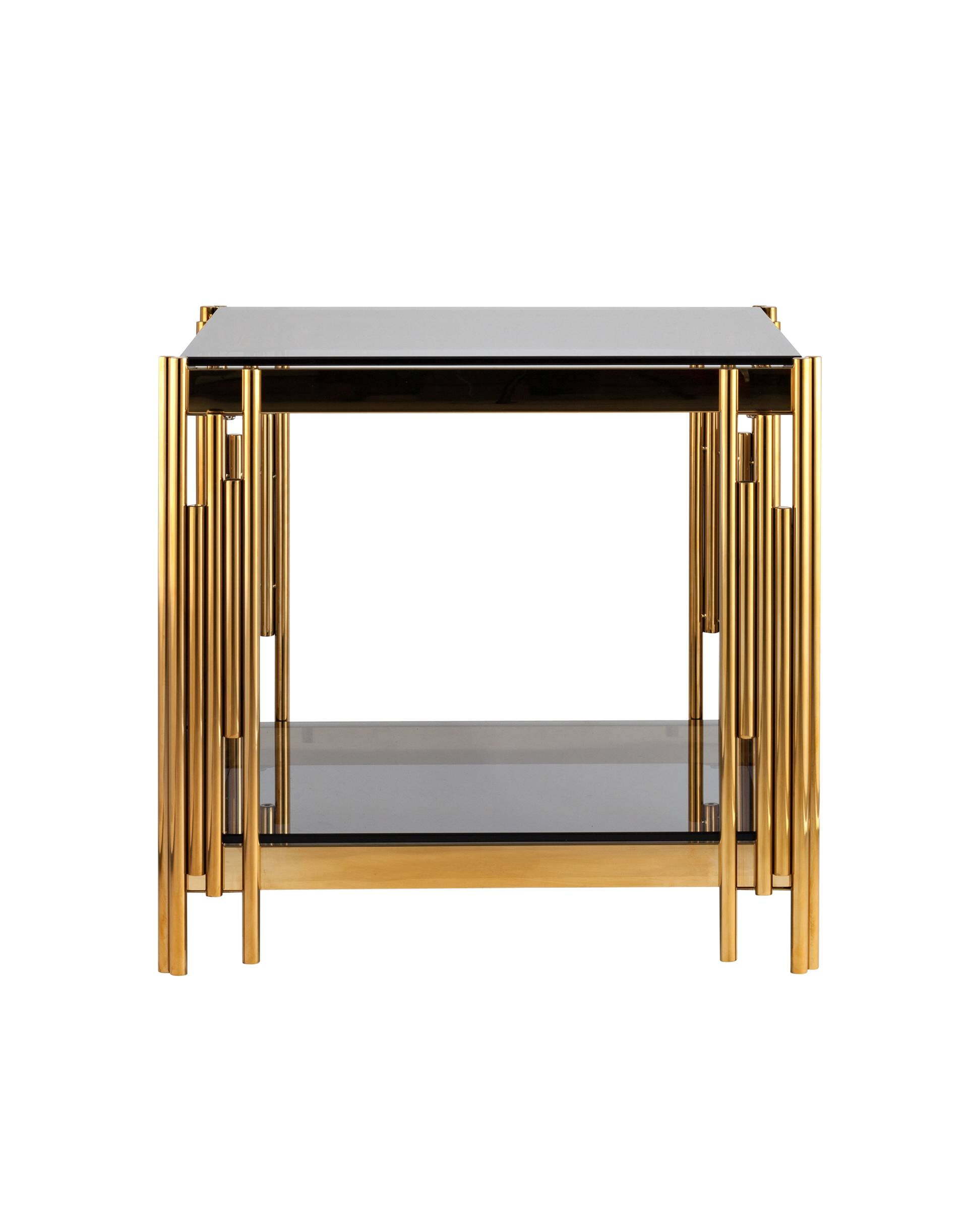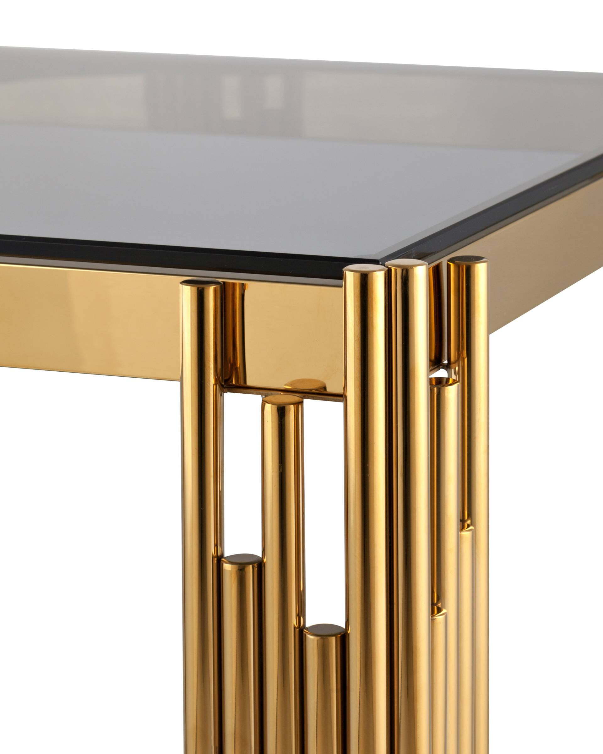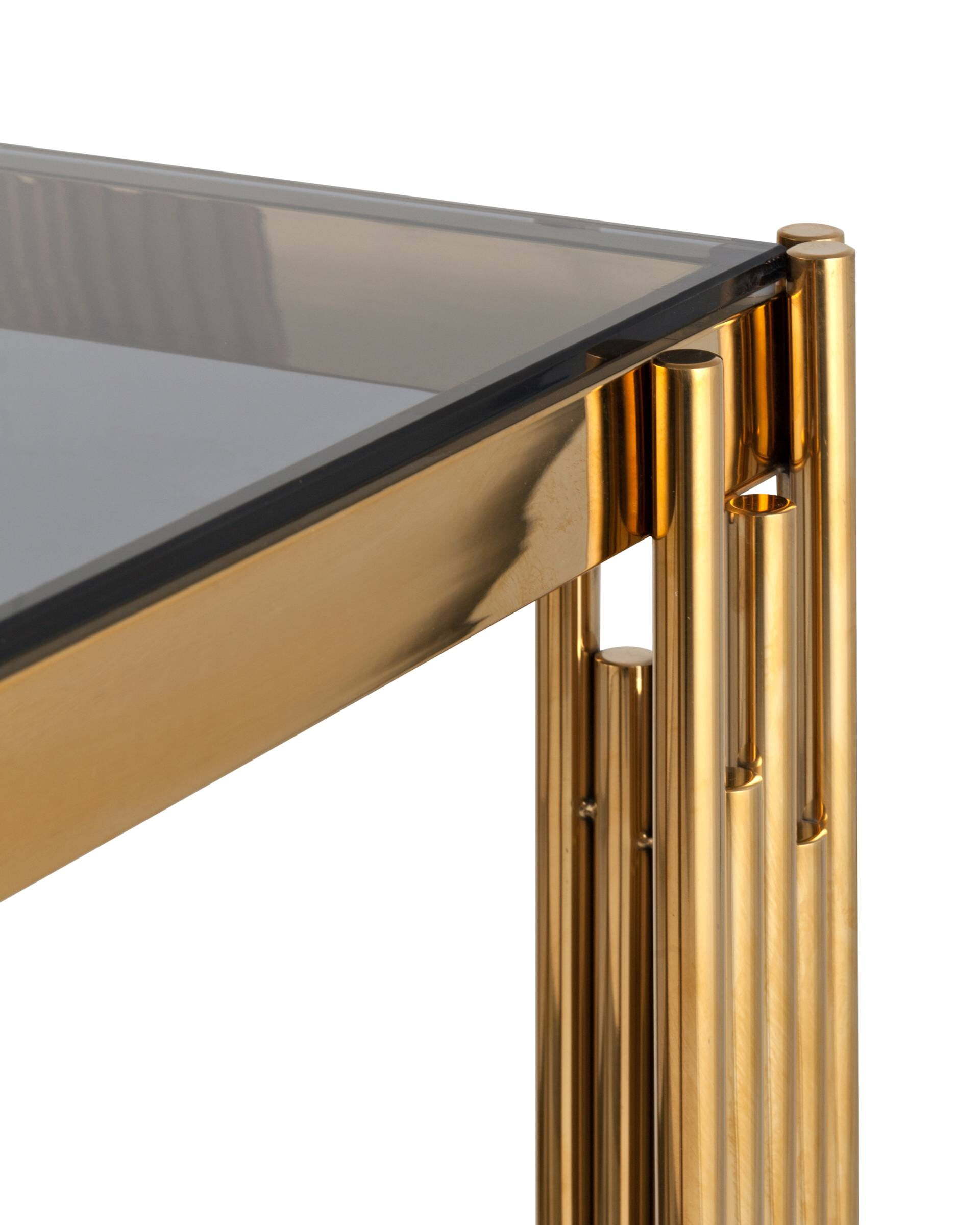 Журнальный столик GETSBI с золотым стеклом и стеклом Smoke является идеальным дополнением для любого интерьера. Он имеет привлекательный дизайн, выполненный из материалов высокого качества. Он имеет прямоугольную форму со скругленными углами и изящными подставками для ручек. Столик выполнен из металла и золотого стекла, а также имеет стеклянную поверхность цвета Smoke. Он идеально подходит для домашнего использования и предлагает практичность и стиль.