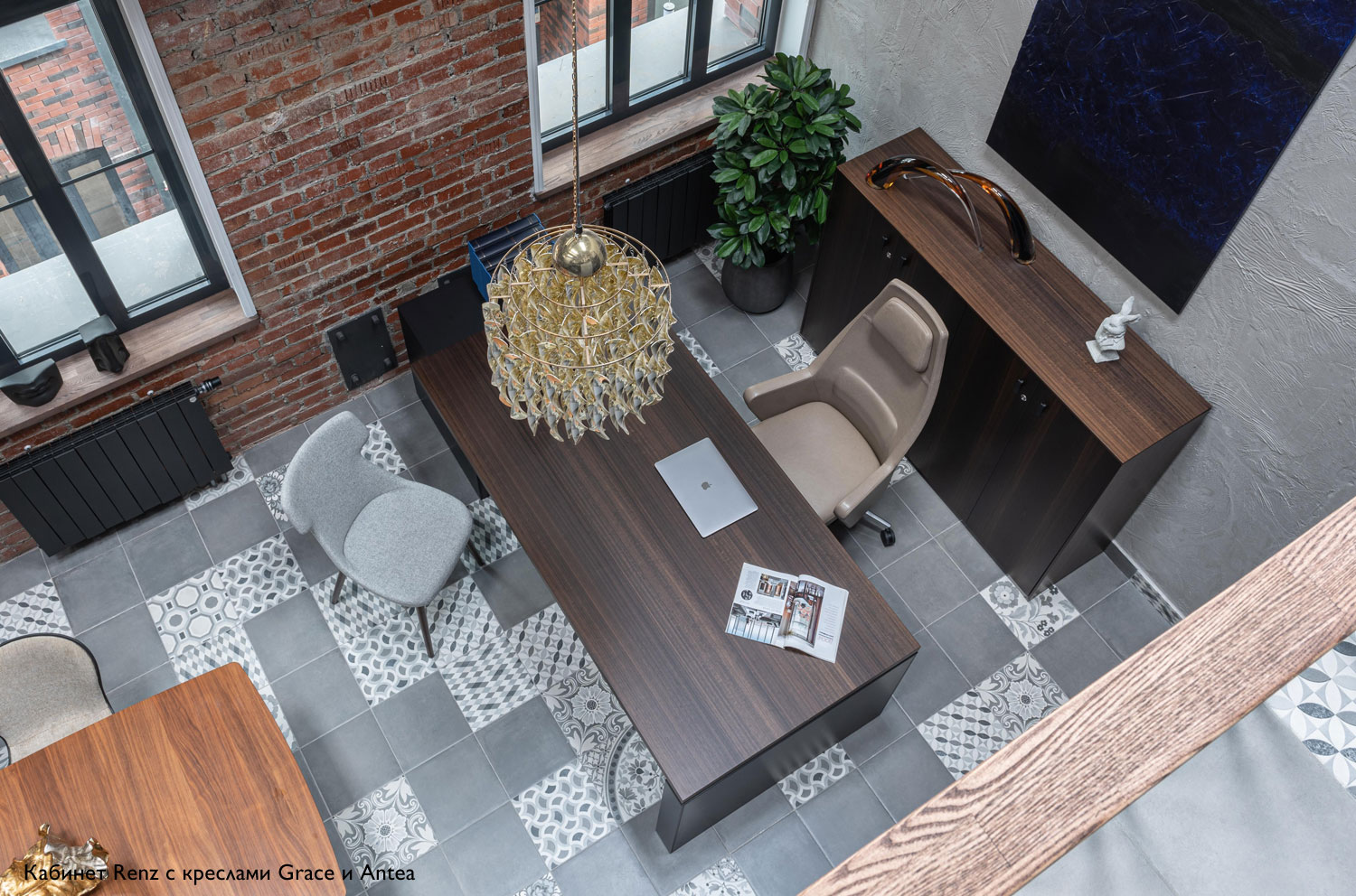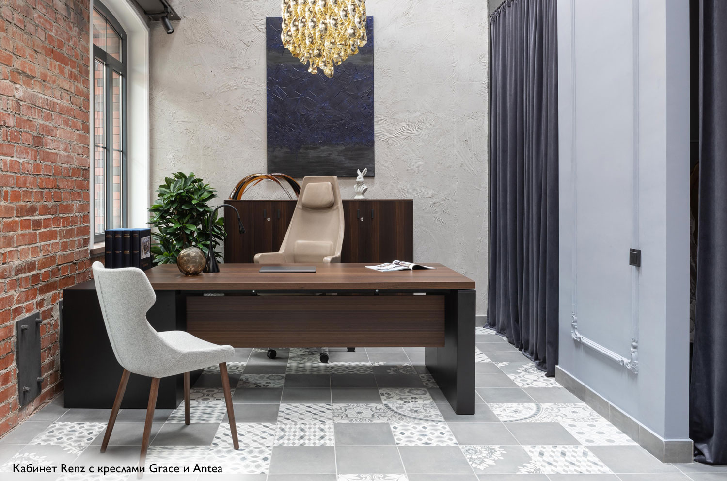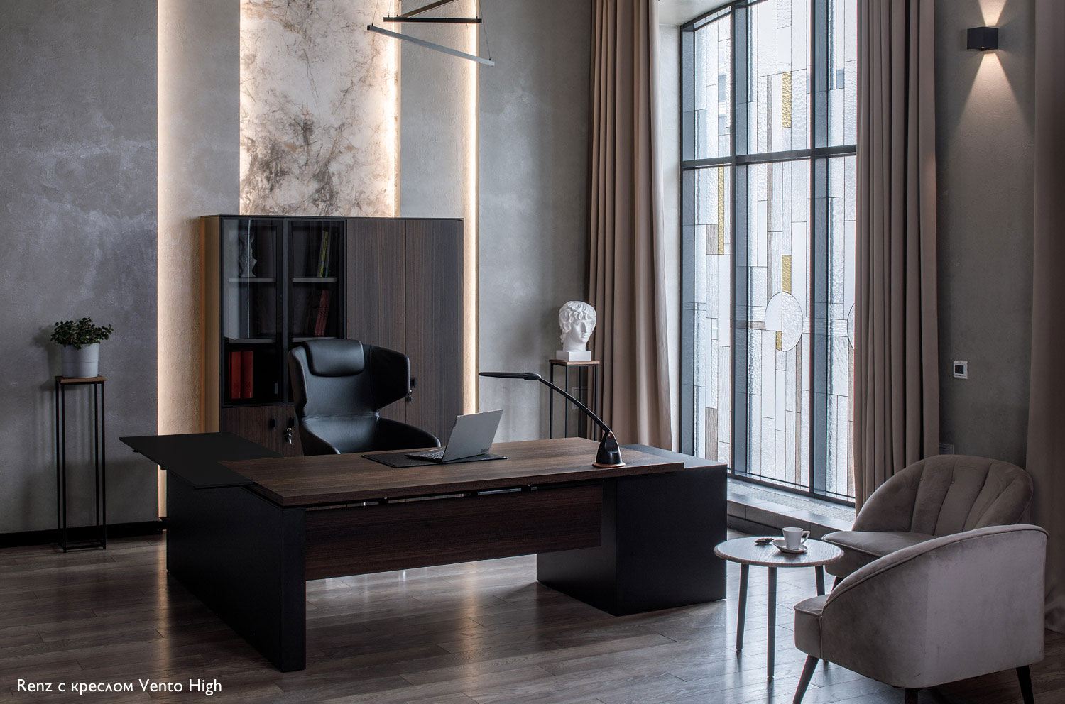 Коллекция Renz олицетворяет собой гармонию эстетики и функциональности, создавая идеальное рабочее пространство для современных лидеров. В центре внимания – изысканный письменный стол, покрытый шпоном эвкалипта, доступный в четырех вариантах. Стол может быть установлен на опорах, опорной тумбе, с приставкой или с опорной тумбой с приставкой. Конструкция элементов стола доведена до скульптурной четкости, а черный матовый ЛДСП со встроенными кабель-каналами обеспечивает не только элегантный внешний вид, но и удобство в организации рабочего пространства.