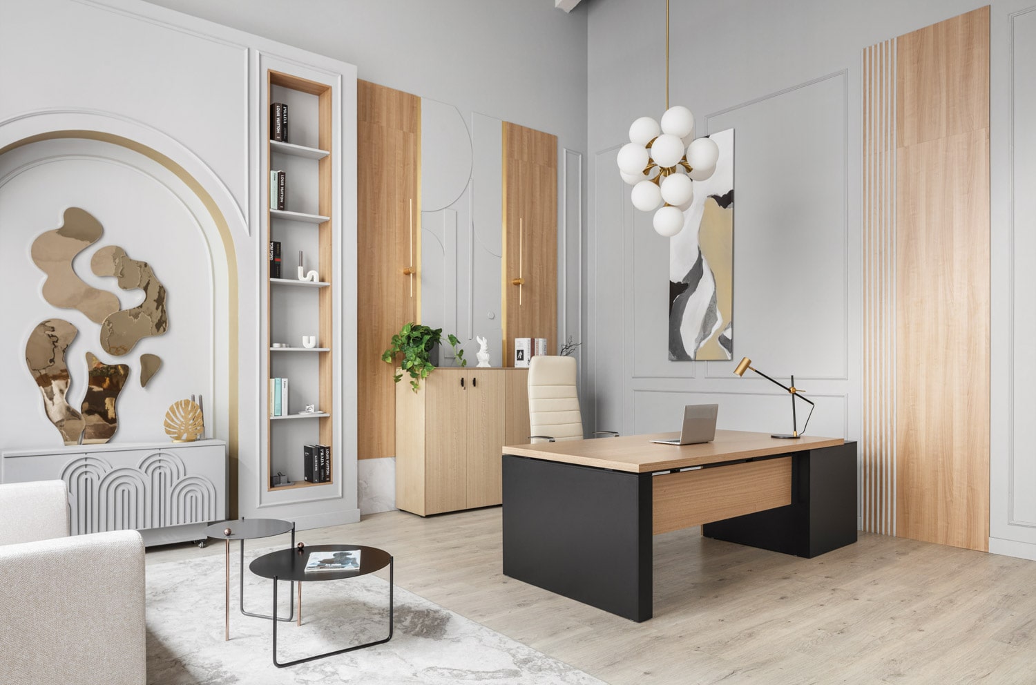 Мобильная тумба и приставка подкатная из меламина и шпон эвкалипта, снабженные системой плавного закрывания и центральным замком, а также шкафы с алюминиевыми дверями, покрытыми порошковой краской, не только добавляют комфорт, но и гарантируют долговечность и износоустойчивость. Компакт-плита soft-touch отличается высокой прочностью и термоустойчивостью, что подчеркивает прочность и утонченность данной коллекции. Переговорные столы с электрификационными модулями обеспечивают удобство и модернизированные рабочие места, делая кабинет Renz воплощением стиля и инноваций.