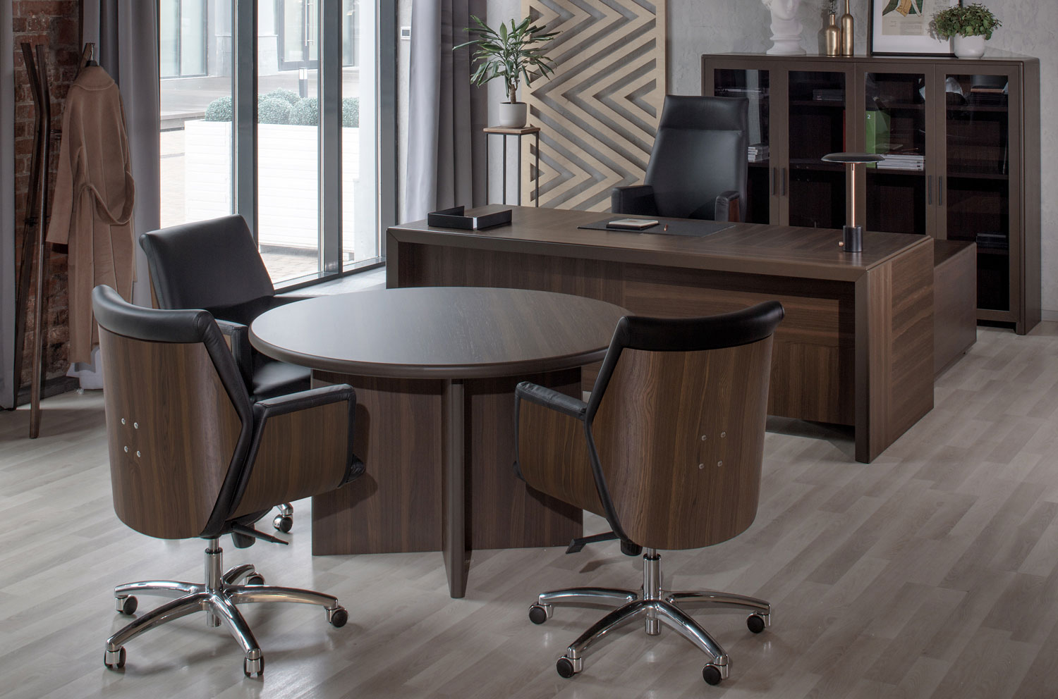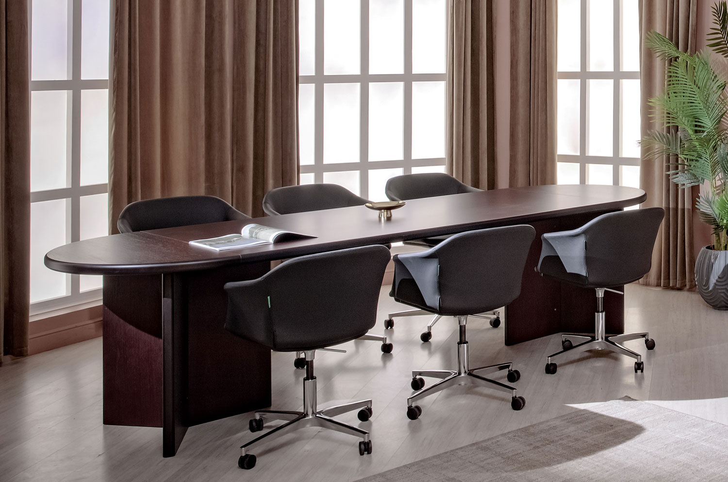 Коллекция Forte / Tempio представляет собой воплощение элегантного дизайна и высокофункциональности для создания эффективной рабочей среды. Центральным элементом этой коллекции является уникальный стол для переговоров, состоящий из составных модулей: столешницы размером 200х100 см, 90-градусного сектора 100х100 см (размеры 108х108 см) и 180-градусного сектора 100х50 см. Опора стола выполнена в виде трилистника из трех панелей размером 36хh71 см, соединенных треугольной стойкой из массива, обеспечивающей надежность и стабильность всей конструкции. Все элементы изготовлены из МДФ толщиной 41 мм с отделкой шпоном, придающей мебели благородный вид. Плавные закругления краев столешницы и секторов добавляют утонченности, делая эту коллекцию идеальным решением для современного офиса.