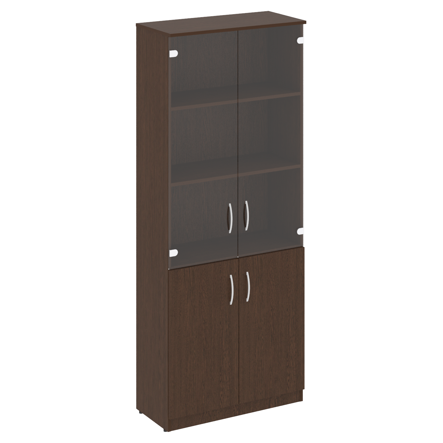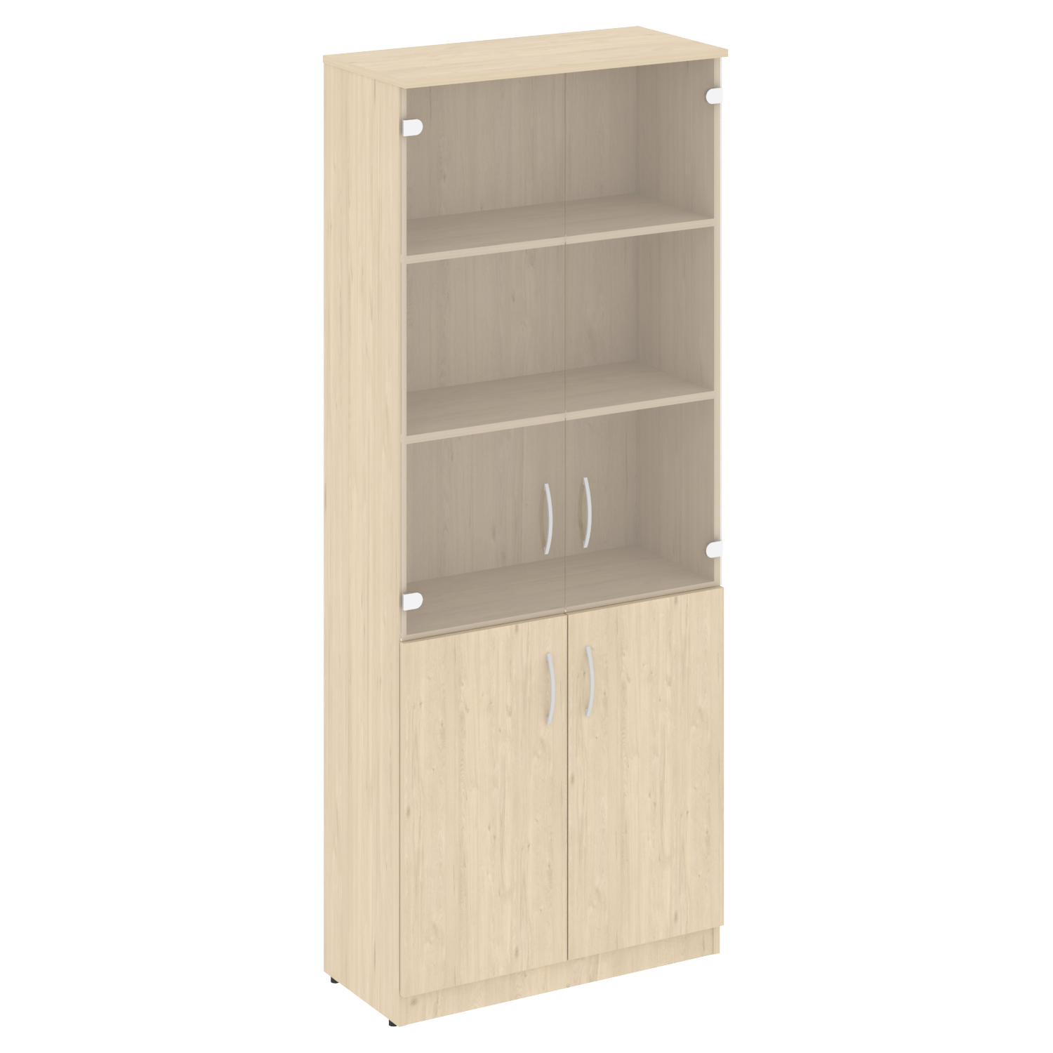 Этот модельный шкаф идеально подойдет для офисного пространства. Он выполнен из качественного ламинированного ДСП в светло-сером цвете. Шкаф имеет высокую и широкую конструкцию с двумя нижними дверями и двумя средними дверями со стеклянным вставками. Он имеет высокую надежность и долговечность. Шкаф имеет размеры 770 х 360 х 360 мм. Он прекрасно дополнит любой интерьер и предоставит дополнительное пространство для хранения.