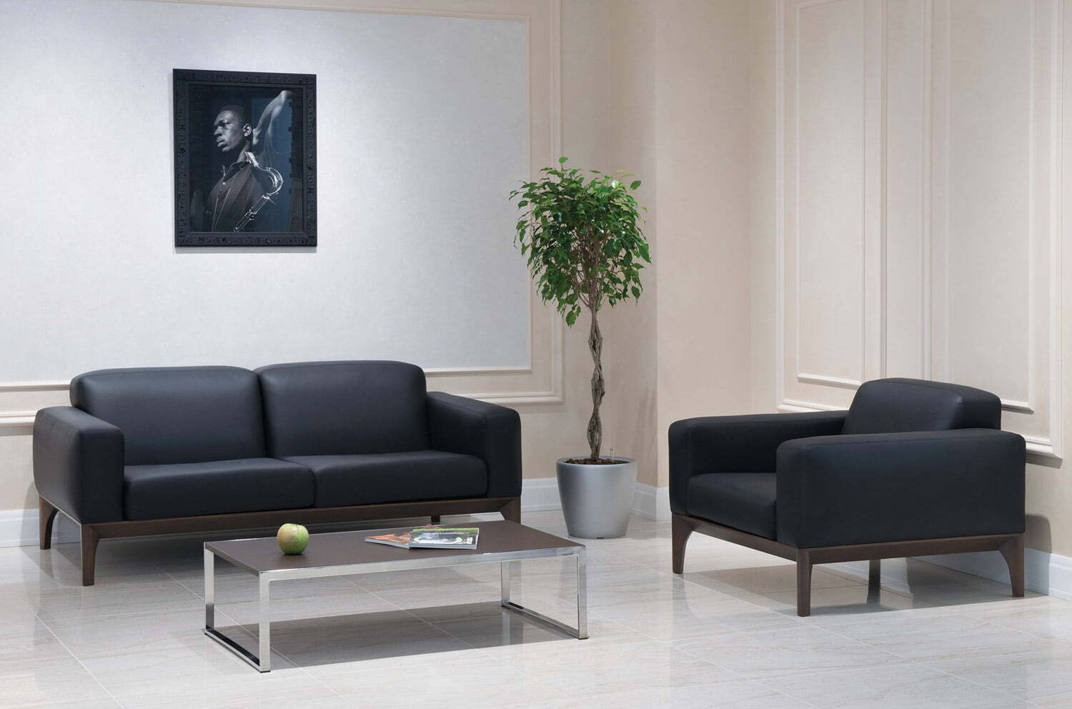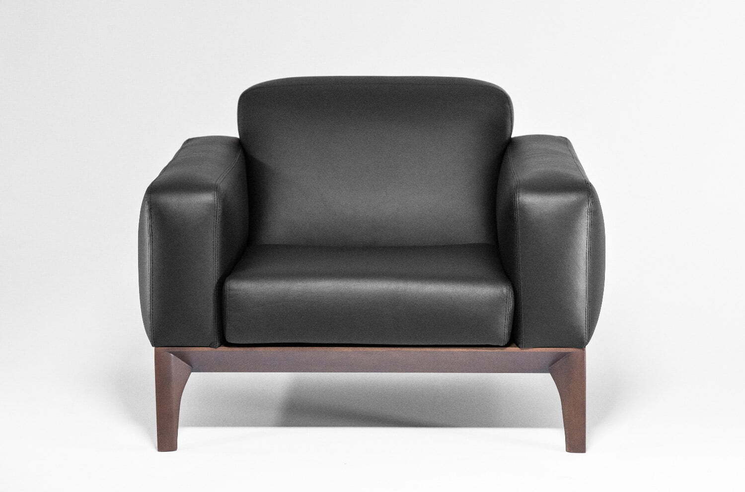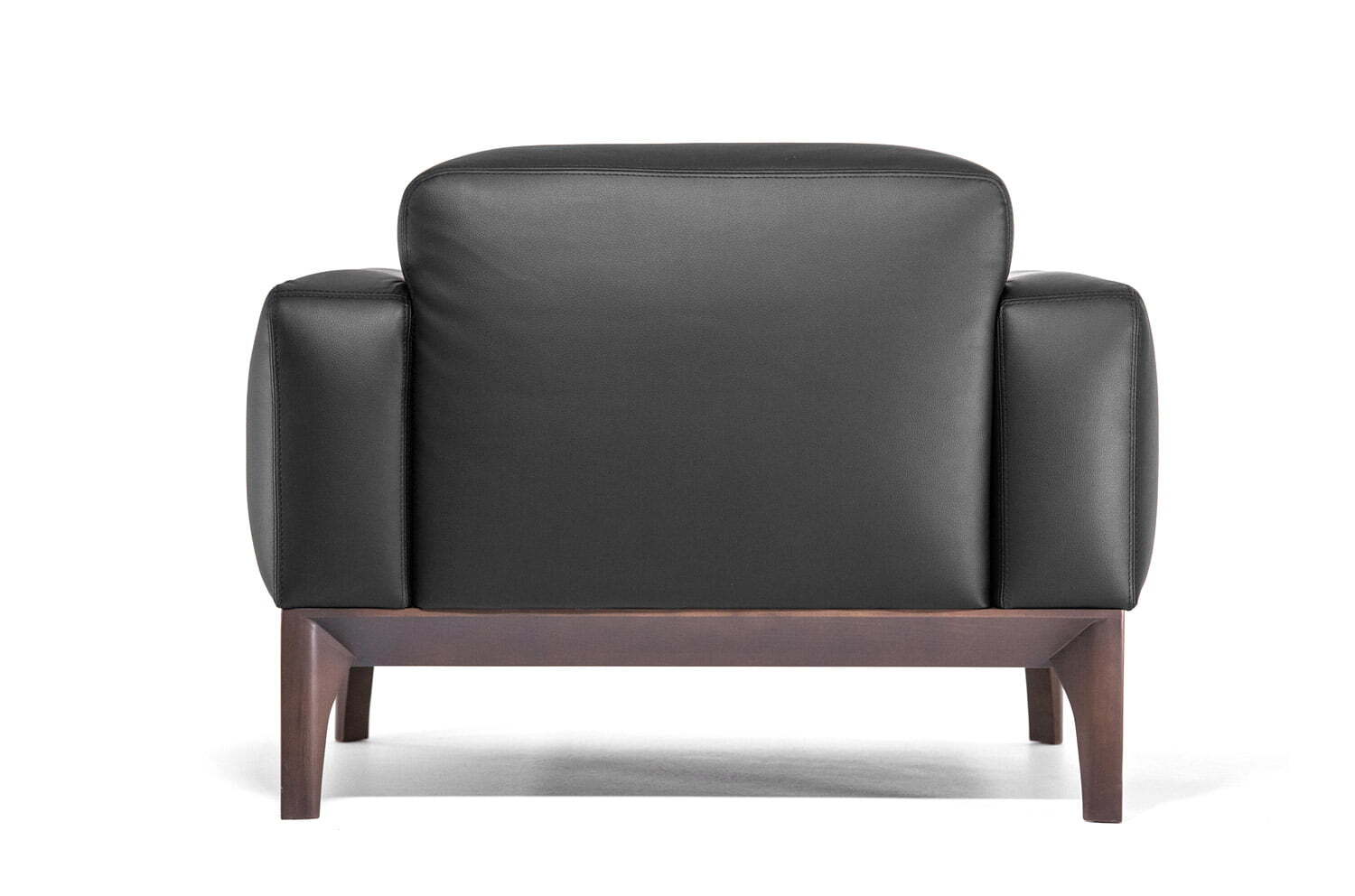 Ассортимент коллекции: двух- и трехместные диваны и кресло, выполненные в черной коже (задняя часть спинки – искусственная кожа) с деревянными опорами в гармоничном оттенке табака.