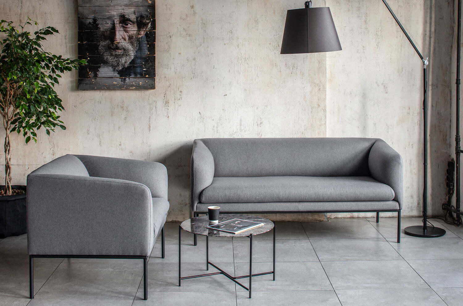 Ассортимент коллекции: двухместный диван и кресло с обивкой из войлока или кожи серого цвета.