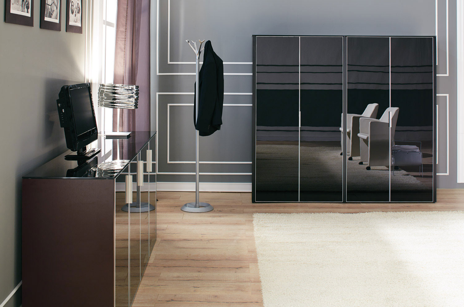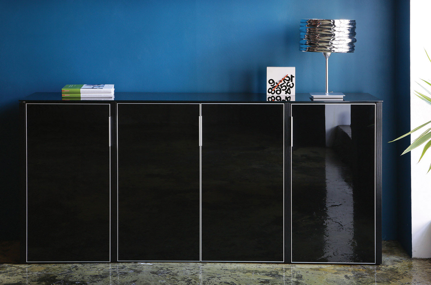 Коллекция систем хранения Gala создана для кабинетов руководителей, подчеркнув безупречный стиль и утончённость в каждой детали. Высокие и низкие шкафы выполнены из ЛДСП EGGER в черном или белом матовом цвете и оснащены стеклянными дверями из стемалита толщиной 4 мм в алюминиевой раме. Стемалит— это закаленное эмалированное стекло, не восприимчивое к воздействию внешних факторов и соответствующее экологическим стандартам. Комфорт и функциональность обеспечиваются механизмом плавного закрывания дверей и компенсаторами неровности пола до 25 мм. Внутреннее наполнение шкафов можно варьировать, адаптируя под конкретные нужды: от полок до гардеробных отсеков. Шкафные композиции представлены в различной конфигурации, от низких четырёхдверных шкафов высотой 88 см до высоких вариантов 170 см, что позволяет создавать индивидуальные решения для любого кабинета руководителя.